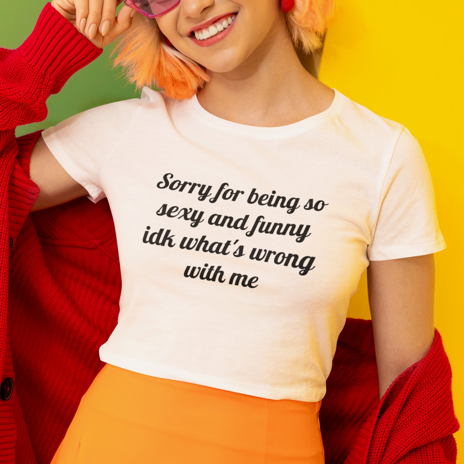 Rock this sassy crop top that says it all ‘Sorry for being so sexy and funny, idk what’s wrong with me.